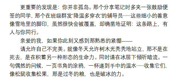 据悉,学院心理工作站将对征集作品进行遴选,并通过公众号等平台展示优秀文稿,让真挚的叙述触动更多人,使温暖的力量在校园中持续流动。文字如炬,足以驱寒暖心;分享如桥,亦可聚力成长。本次冬日暖心树洞征文活动,既是学院心理健康教育工作的创新实践,也体现了学院对学生成长需求的持续关注与人文关怀。学院心理工作站将继续拓展心理健康教育载体,丰富支持形式,陪伴学子们在书写与阅读中沉淀心绪、锻炼心智,以更从容、积极的心态迎接期末挑战,在成长的道路上积蓄温暖,凝聚前行之力。