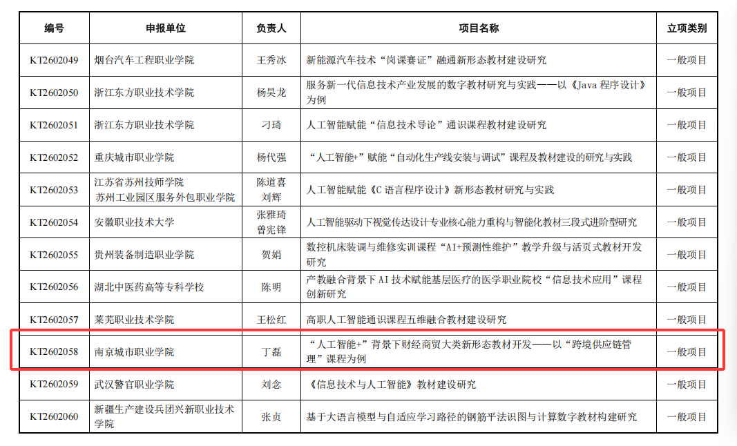 近日,教育部职业院校信息化教学指导委员会发布《关于2026年度全国高等职业院校信息化教学改革暨教材建设研究项目立项通知》(信息化教指委〔2026〕9号),经专家严格评审、层层遴选,我校数字财商学院丁磊老师申报的“‘人工智能+’背景下财经商贸大类新形态教材开发——以‘跨境供应链管理’课程为例”成功入选立项名单。