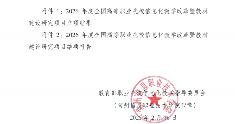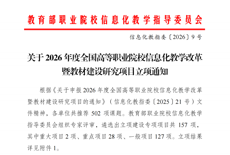 此次立项是对我校在信息化教学改革与教材建设领域研究能力、实践水平的认可,也是我校深耕职业教育教学改革、推进教育数字化转型的重要成果。该项目的立项,将进一步推动我校相关学科专业的教学创新,助力教材体系与信息化教学深度融合,为提升人才培养质量注入新动能。